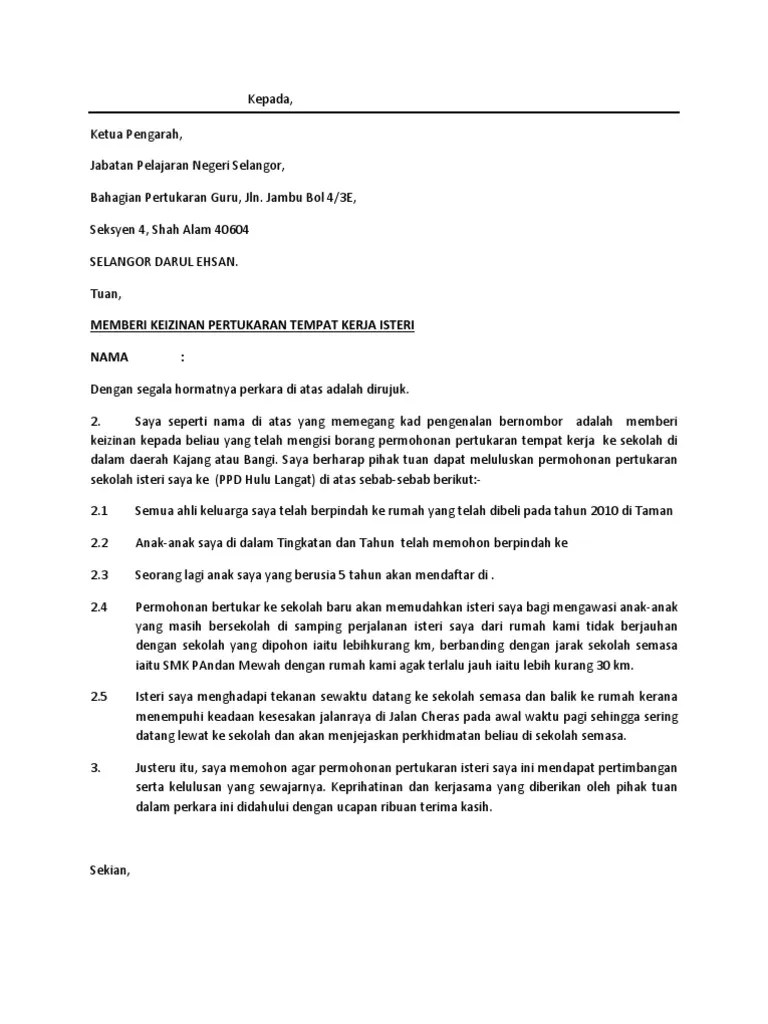 Surat Sokongan Permohonan Pertukaran Tempat Kerja - Contoh Surat Tunjuk Sebab Pertukaran Tempat Kerja Letter 7saudara Com. Motivated by self employed inner sense and think positive is my abilities. 01.11.2021 · bagi permohonan kursus, agensi terbabit perlu mengemukakan surat permohonan menghadiri kursus yang berkaitan kepada komandan akademi bomba dan penyelamat (abpm) yang berkenaan. Contoh surat mohon tukar tempat kerja. 11.01.2012 · berikut adalah contoh contoh surat permohonan pertukaran tempat kerja. Walau bagaimanapun, bagi tujuan mengemaskini maklumat peribadi yang lain, tuan dikehendaki untuk mengemukakan satu surat pemberitahuan beserta dokumen … View all posts by razlan posted on january 11, 2012 february 11, 2022 author razlan … 08.06.2021 · contoh nota serah tugas ini adalah format yang sesuai sama ada untuk guru atau kakitangan kerajaan lain yang bertukar tempat kerja.